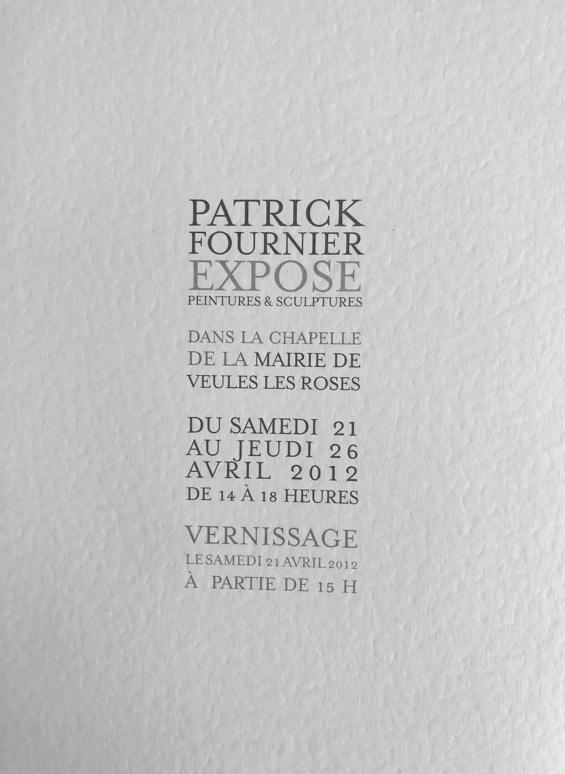 "Avril 2012 – Mon ami Patrick expose ses peintures et ses sculptures dans la Chapelle de Veules-les-Roses. Belle occasion de nous retrouver déambulant au sein des paysages qu’il aime et qui l’inspirent. Camaïeu de gris du ciel et de la mer, de la pierre et de l’ardoise. Moments précieux de partage et de recueillement dans les petites églises qu’il affectionne. Vitraux et portes entrouvertes sur la lumière. Silence.