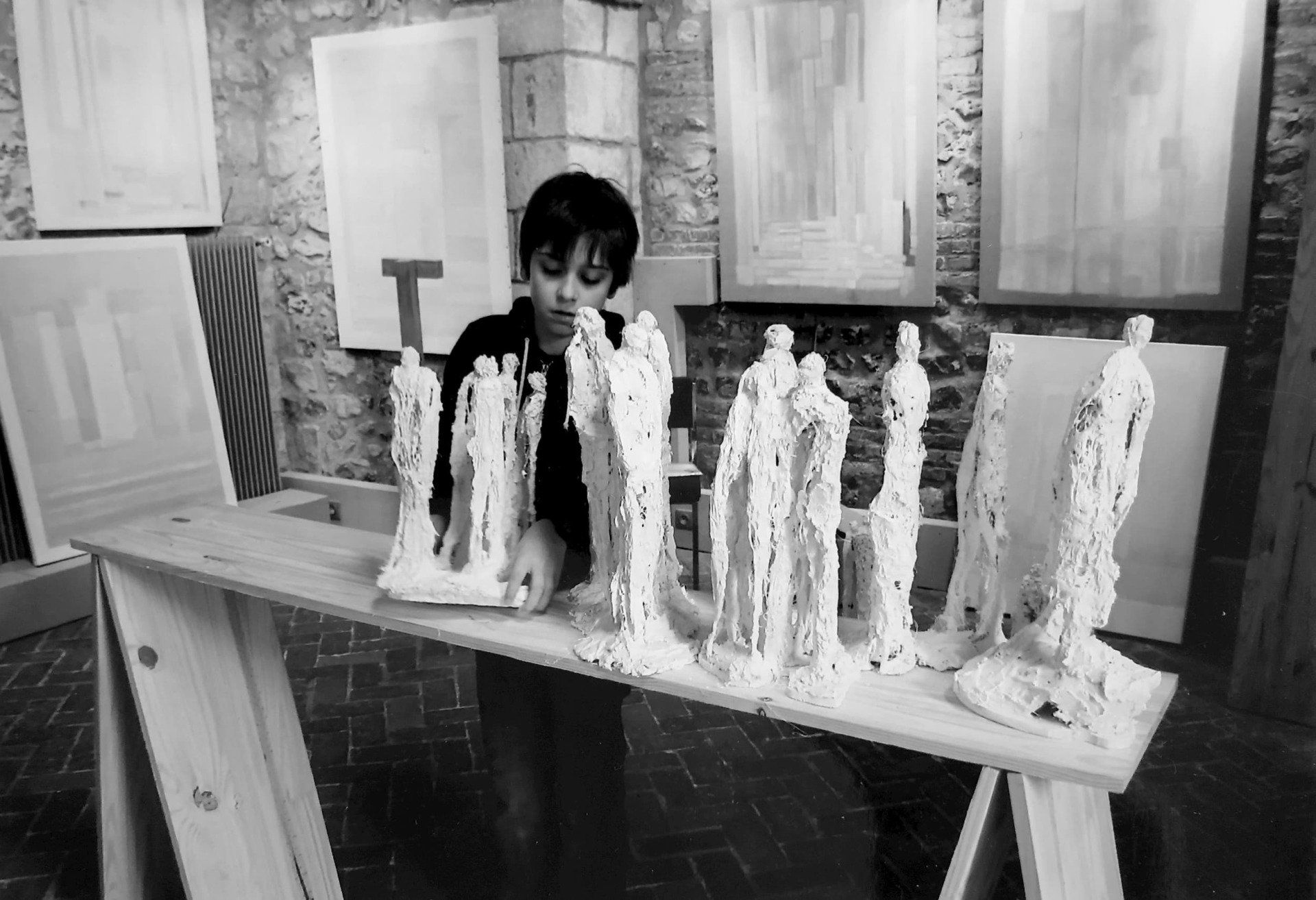 Dans la Chapelle, le même silence s’impose. La profondeur et la transparence des toiles se répondent comme en miroir. Les sculptures, pèlerins en prière, paraissent marcher d’un pas lent." Claude Tharreau